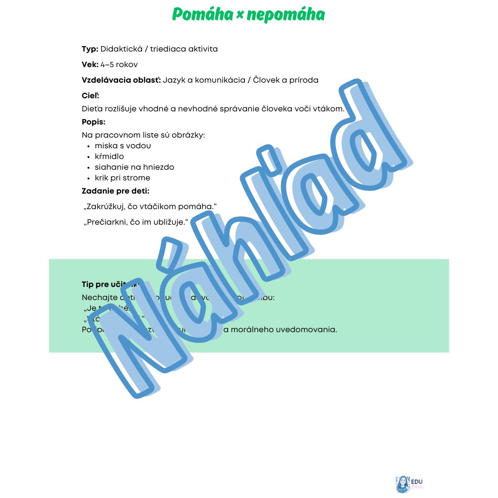 Kompletný celodenný vzdelávací program zameraný na rozvoj ohľaduplnosti, zodpovednosti a praktických spôsobov, ktorými môžu už aj malé deti pomáhať vtáctvu vo svojom okolí