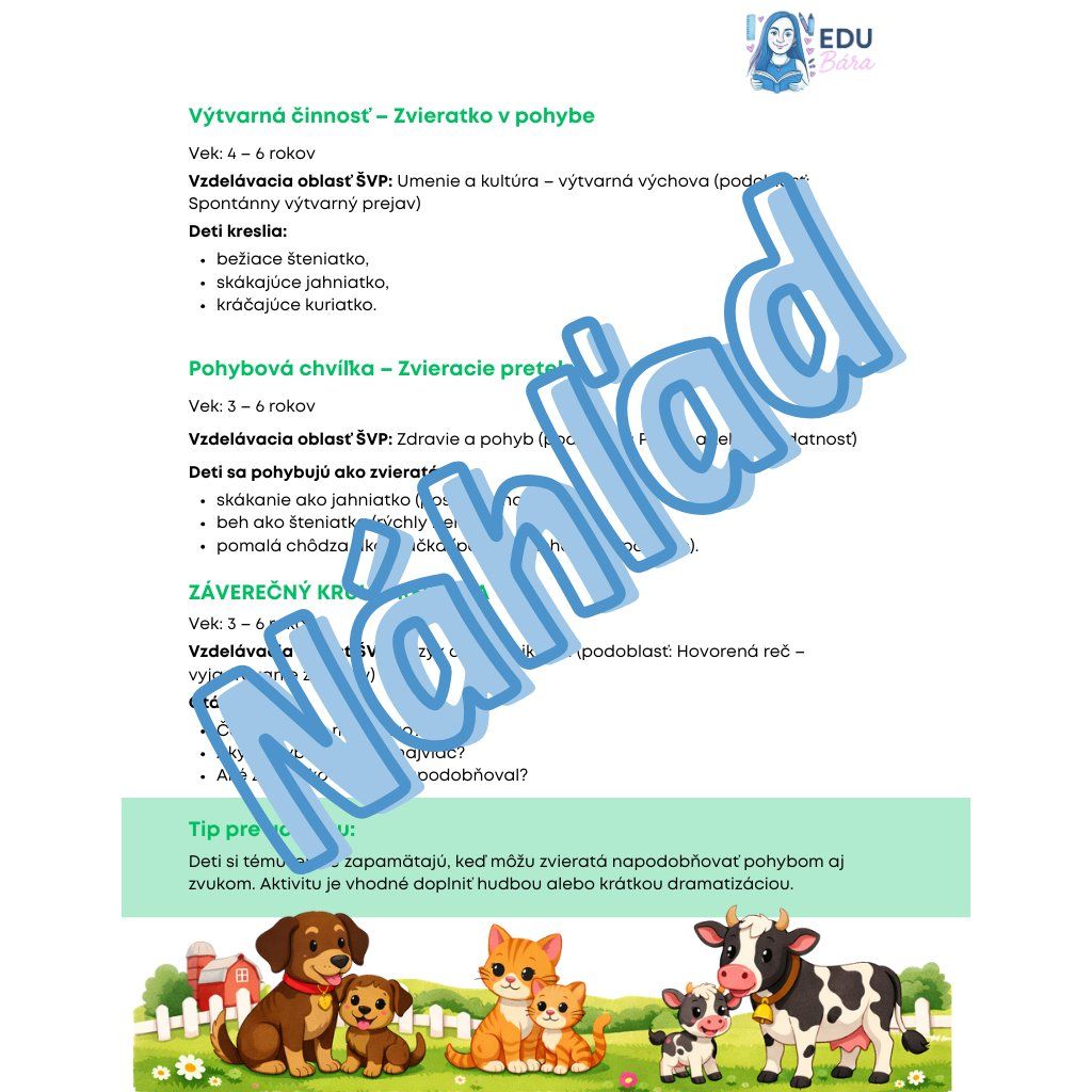 Kompletný celodenný vzdelávací program zameraný na objavovanie pohybových schopností a zručností mláďat. Deti sa hravou formou dozvedia, čo všetko sa musia zvieratká naučiť – od prvých krôčikov až po skákanie či beh