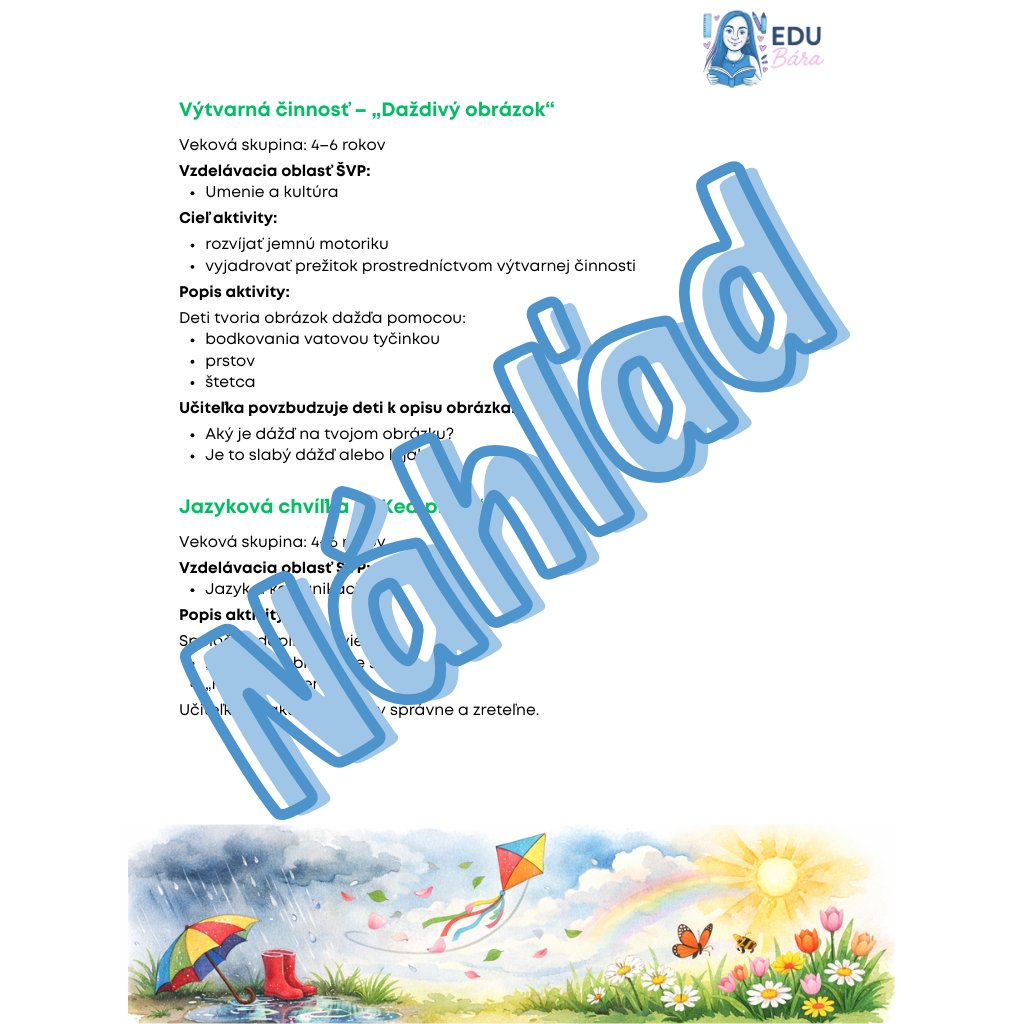 Kompletný celodenný vzdelávací program „Dážď a kvapky“ prináša pedagógom hravý a metodicky spracovaný návod, ako deťom priblížiť kolobeh vody a čaro daždivého počasia