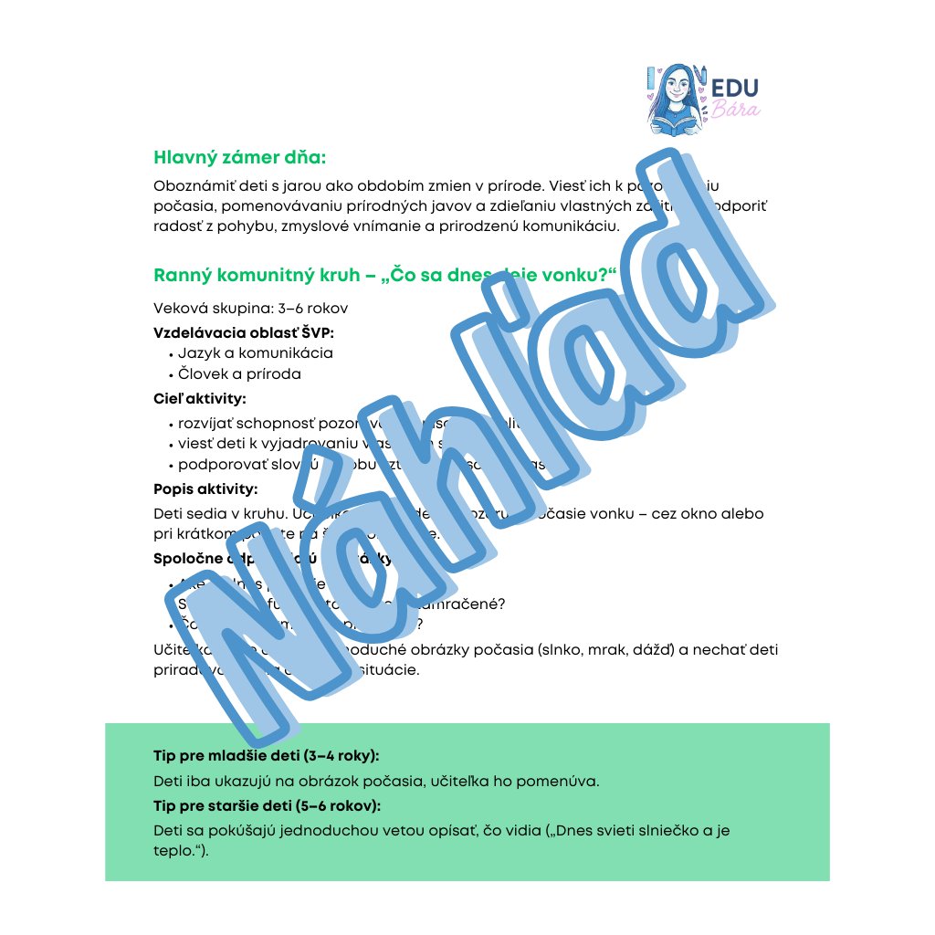 Kompletný celodenný vzdelávací program „Jar sa prebúdza“ je navrhnutý tak, aby deťom hravou formou priblížil prvé jarné zmeny v prírode a rozvíjal ich zmyslové vnímanie.