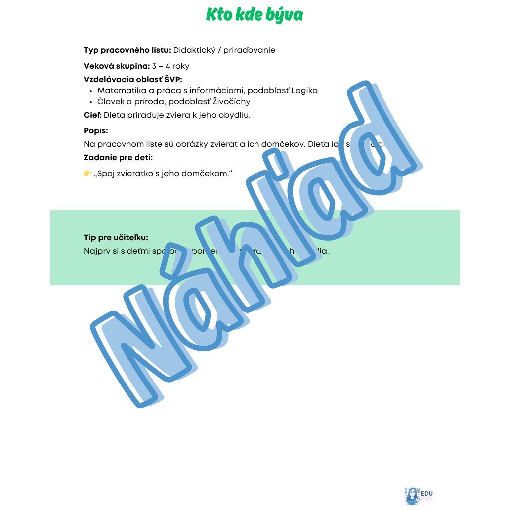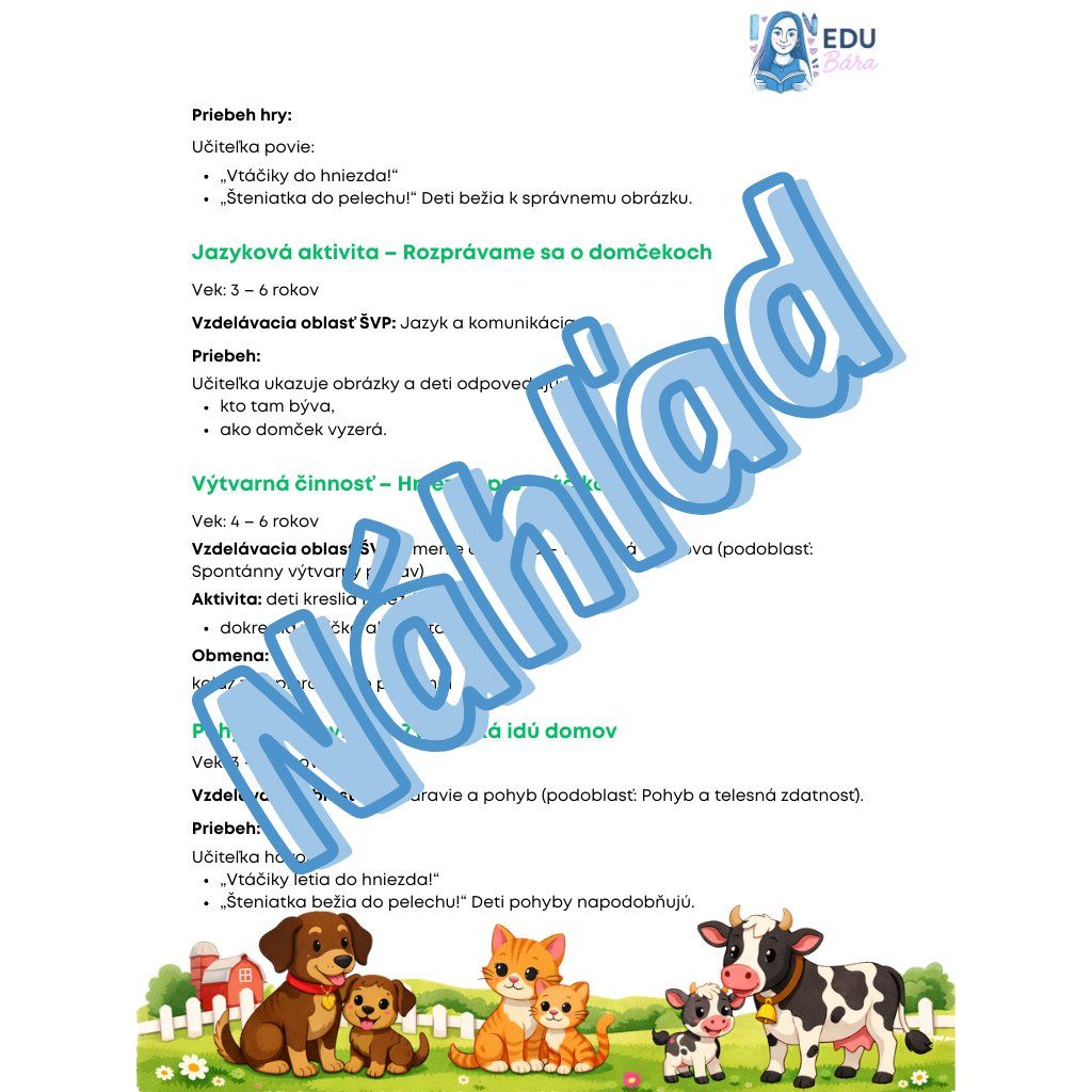 Kompletný celodenný vzdelávací program zameraný na poznávanie prirodzeného prostredia a domovov domácich zvierat. Deti sa hravou formou naučia priraďovať zvieratká k ich obydliam, ako sú stajňa, búda či hniezdo, pričom rozvíjajú svoju priestorovú orientáciu a logické myslenie v súlade s modernými pedagogickými štandardmi