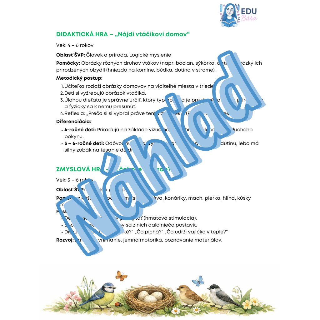 Kompletný celodenný vzdelávací program zameraný na skúmanie vtáčích obydlí, materiálov na stavbu hniezd a dôležitosť bezpečného domova pre každú živú bytosť