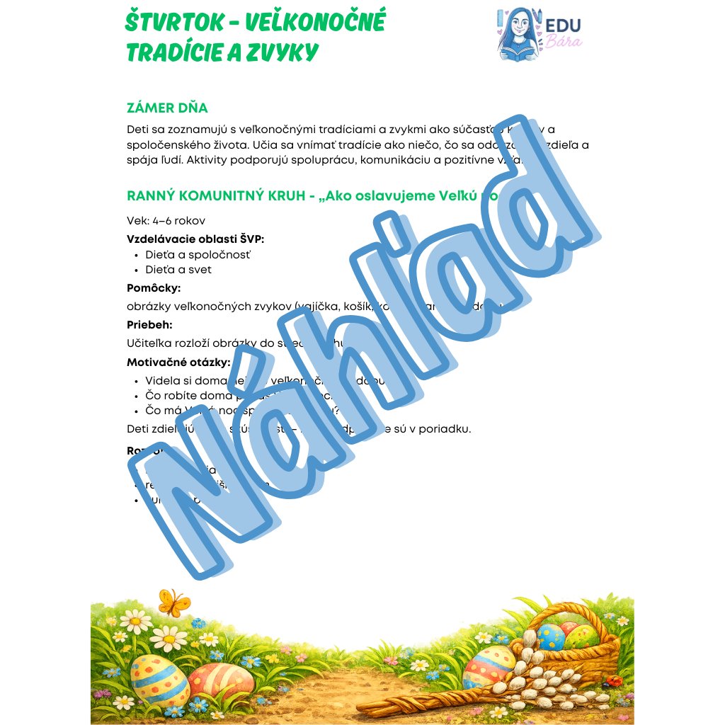 eBook Veľká noc a jarné tradície je komplexný PDF materiál na 70 stranách, vytvorený ako tematický týždeň (pondelok – piatok) pre materské školy v súlade so ŠVP 2026.