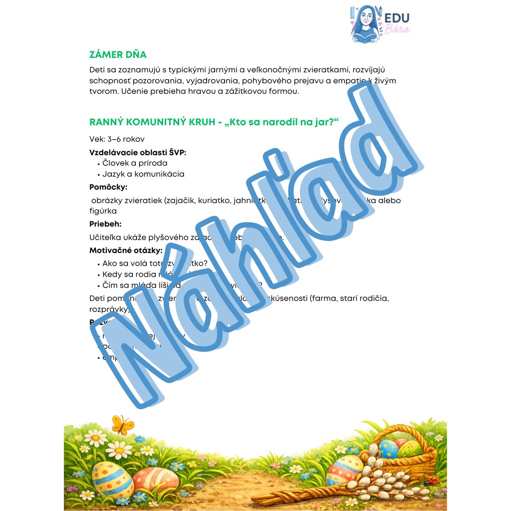 Kompletný celodenný vzdelávací program plný pípajúcich kuriatok a skákajúcich zajačikov, ktorý deťom približuje svet jarných mláďat. Tento metodický materiál hravou formou rozvíja empatiu k živým tvorom a pomáha deťom pochopiť kolobeh života v prírode
