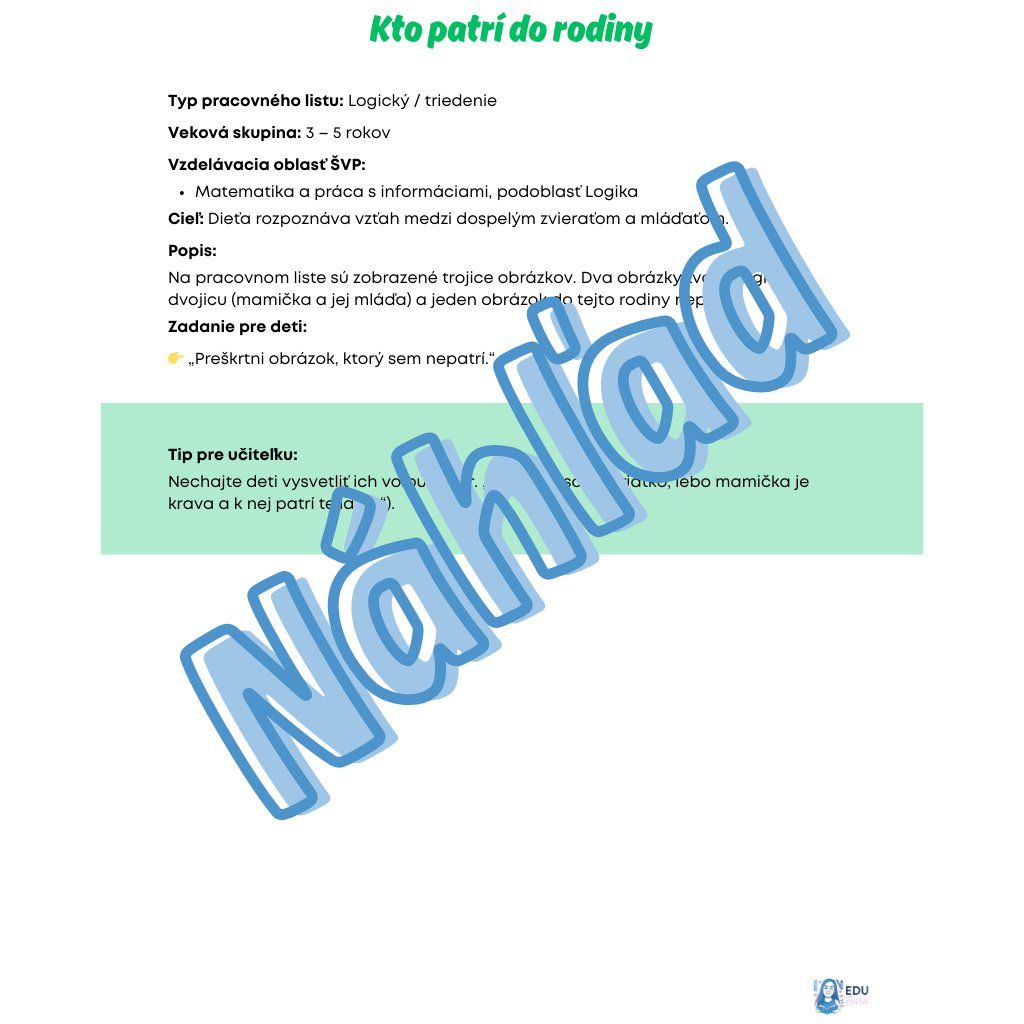Kompletný celodenný vzdelávací program zameraný na upevnenie poznatkov o zvieracích rodinách a vzťahoch medzi mamičkou, oteckom a mláďaťom. Deti si hravou formou systematizujú vedomosti z celého týždňa, učia sa identifikovať členov zvieracej rodiny a rozvíjajú svoju empatiu prostredníctvom diskusie, pohybu a tvorivých činností v súlade s najnovšími pedagogickými štandardmi